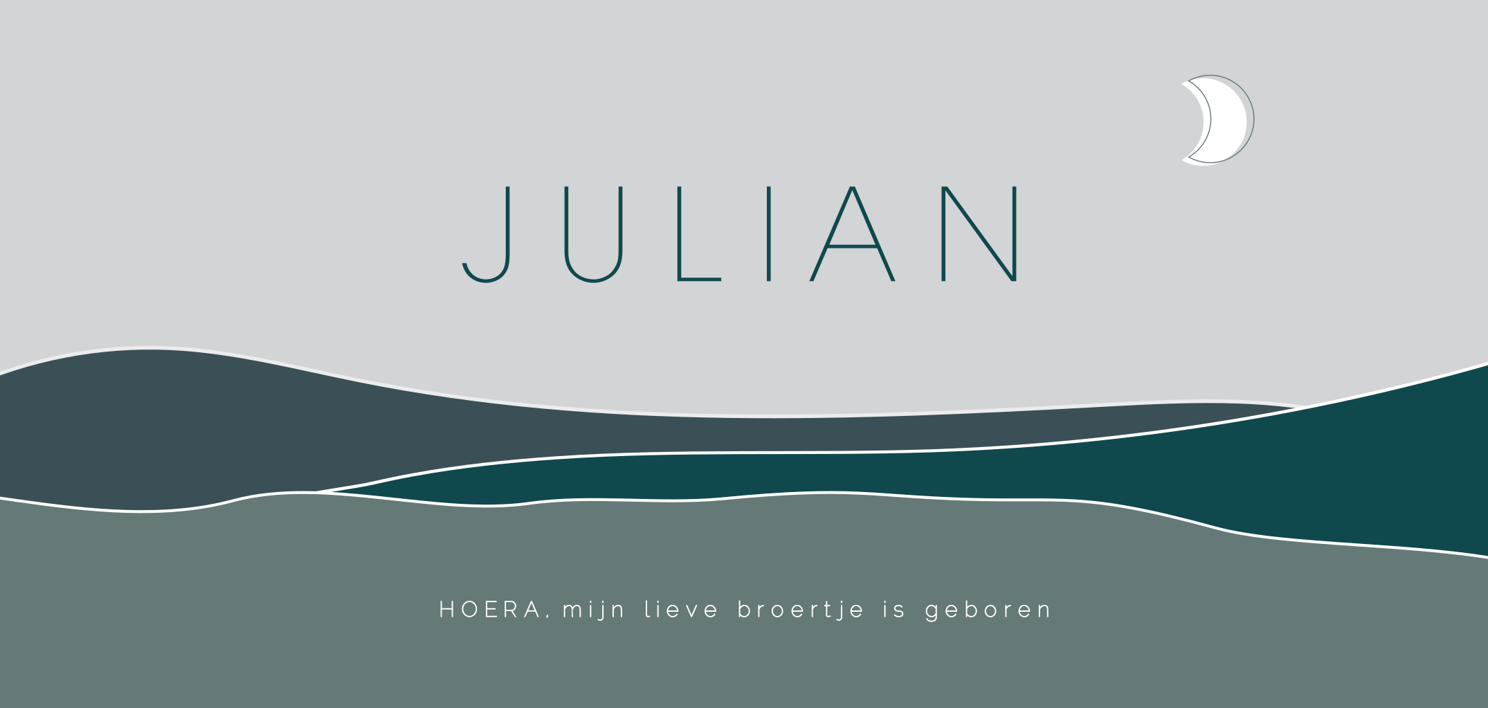 Een jongens geboortekaartje voor een zoon en broertje met de babynaam Julian. Op dit babykaartje staat een heuvelachtig landschap in trendy kleuren. Teksten en kleuren zijn eenvoudig aan te passen in de editor. Hulp nodig bij het ontwerpen? Laat het ons gerust weten.