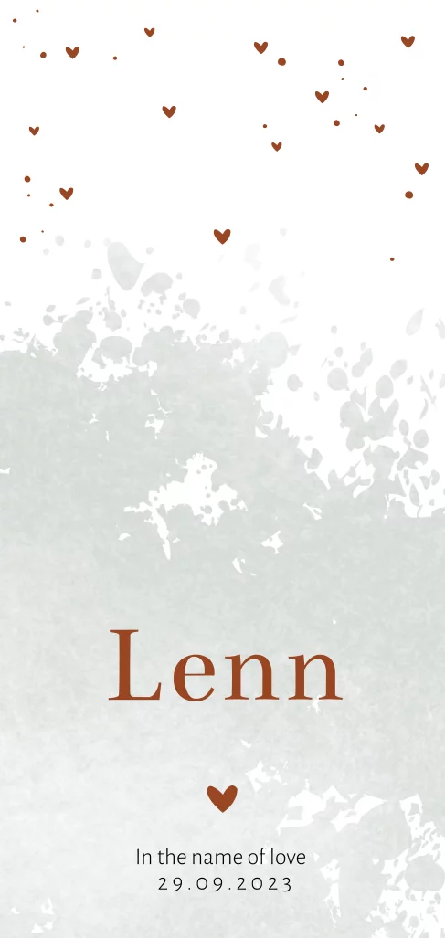 Hip jongens geboortekaartje met trendy kleuren. Dit kaartje Lenn heeft op de achtergrond een groene aquarel. Een mooie combinatie met wit en roestbruin. De kleine hartjes maken het kaartje compleet! Teksten en kleuren zijn aan te passen in de editor.