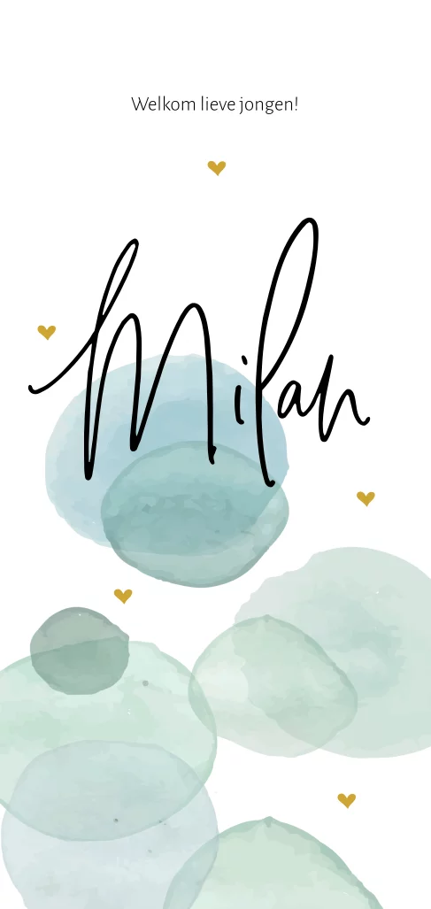 Hip geboortekaartje voor een jongen met watercolor cirkels. De naam op dit babykaartje Milan is geschreven in een sierlijk lettertype.