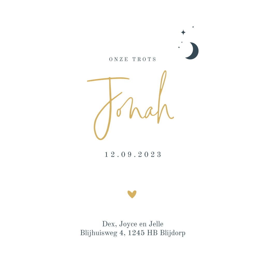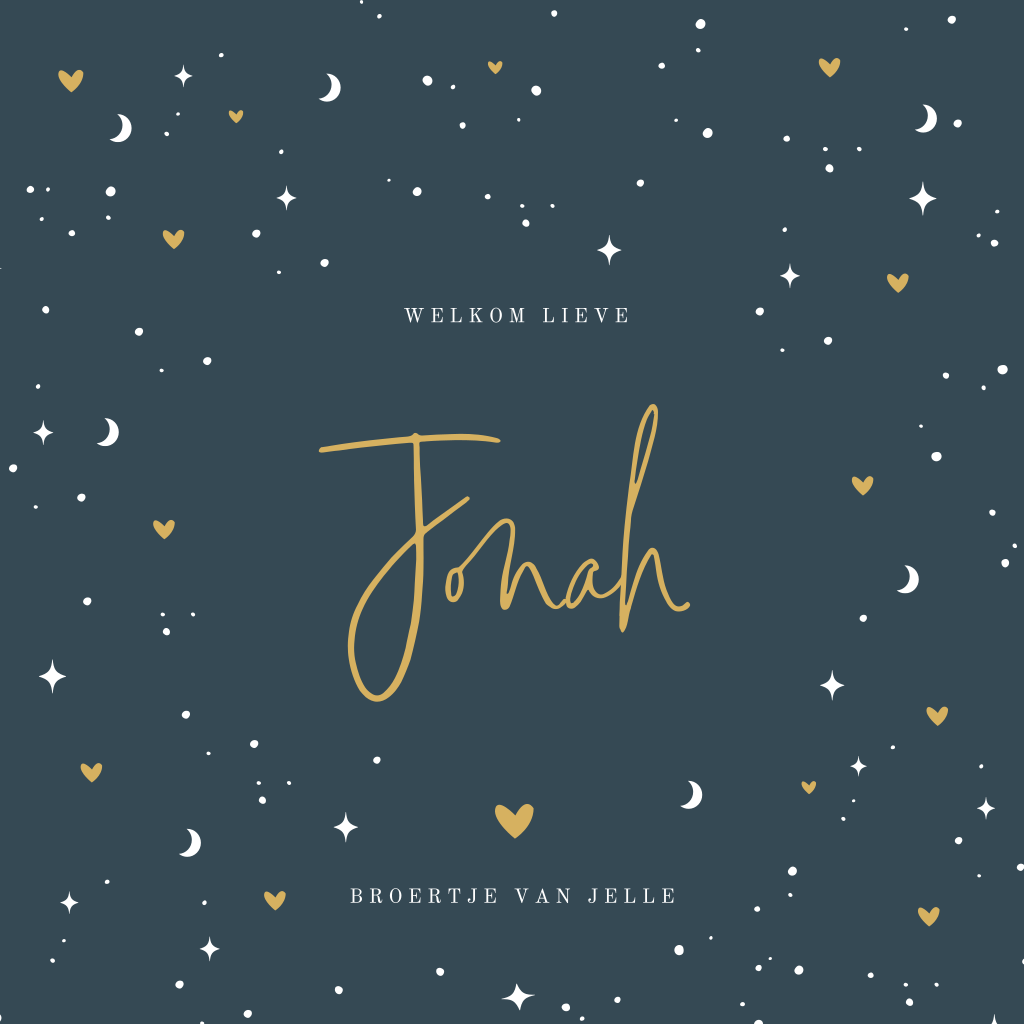 Hip geboortekaartje voor een zoon. Dit kaartje Jonah heeft een mooie donkerblauwe achtergrond met kleine maantjes, sterretjes en hartjes. De teksten en kleuren zijn aan te passen in de editor.