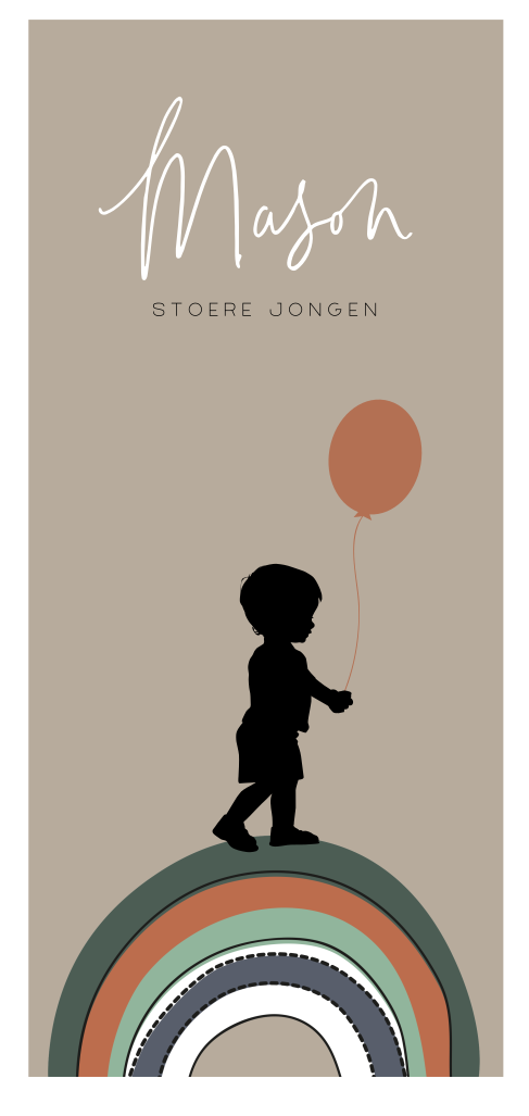 Hip geboortekaartje voor een jongen. Op het kaartje Mason staat een regenboog met daarop een silhouet van een jongen met een ballon in zijn hand.