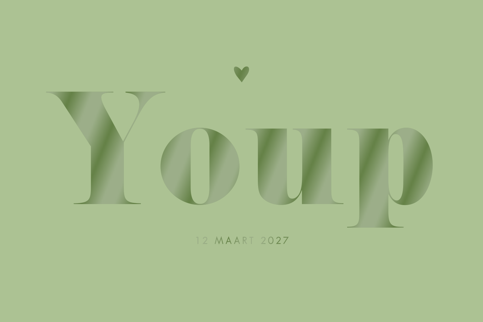 Dit geboortekaartje voor een zoon heeft een basic design. De hippe groene kleur, hoogglans spot-uv en ronde hoeken maken dat dit kaartje er, ondanks het rustige design, uitspringt en stijlvol overkomt. Pas dit jongenskaartje Youp naar je eigen smaak aan in de editor.