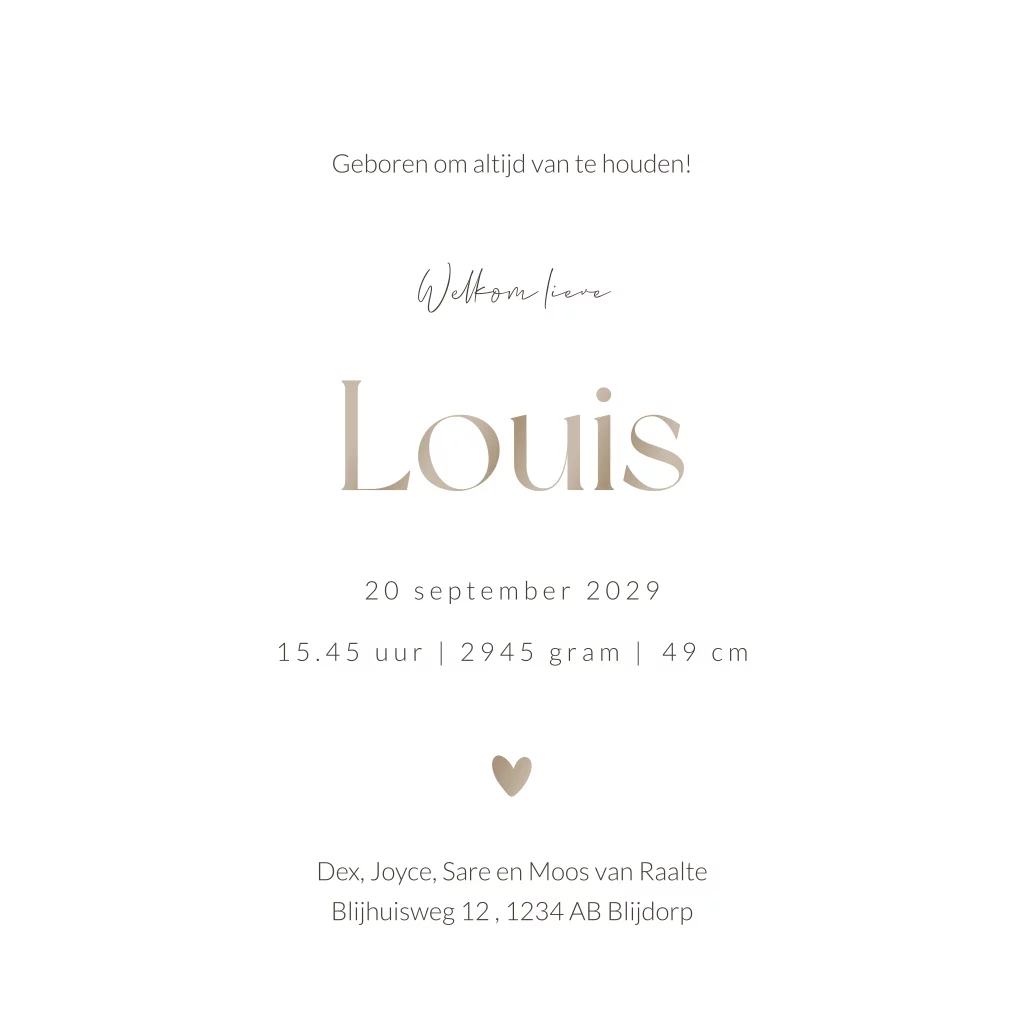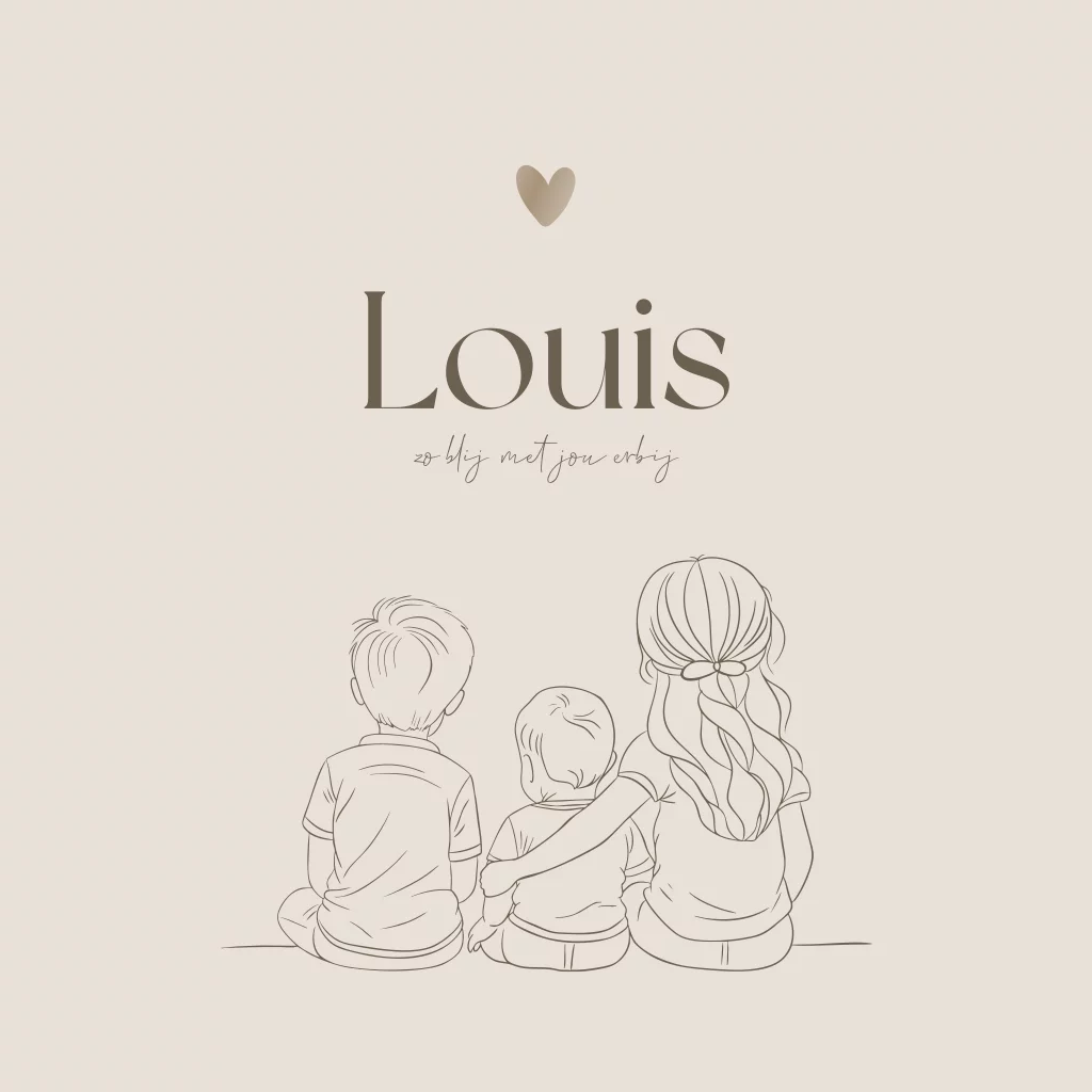 Een prachtig geboortekaartje voor een jongen met lijntekening. Dit kaartje Louis heeft een stijlvolle lijntekening van drie kindjes. Je ziet op de lijntekening grote zus, grote broer en het kleine broertje. De beige achtergrond en bruine kleurtinten zorgen voor een basic design. Een ideaal geboortekaartje voor ouders die op zoek zijn naar een kaartje voor hun derde kindje. De hoogglans zorgt voor een speels effect. Een lijntekening op maat voor jullie zoon? Stuur ons gerust een berichtje!