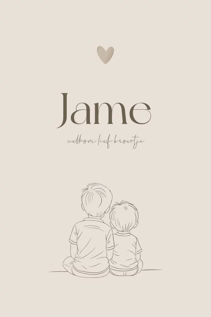 Een stijlvol geboortekaartje voor een jongen. Dit geboortekaartje James bevat een lijntekening van een grote broer en klein broertje. De beige kleurtinten en de hoogglans zorgen voor een stijlvol geheel. De afgeronde hoeken zorgen voor een speels effect. Pas dit geboortekaartje voor jullie zoon naar eigen wens aan in onze online editor. De metallic beige envelopkleur maakt dit geboortekaartje helemaal in stijl af. Een lijntekening op maat? Stuur ons gerust een berichtje!