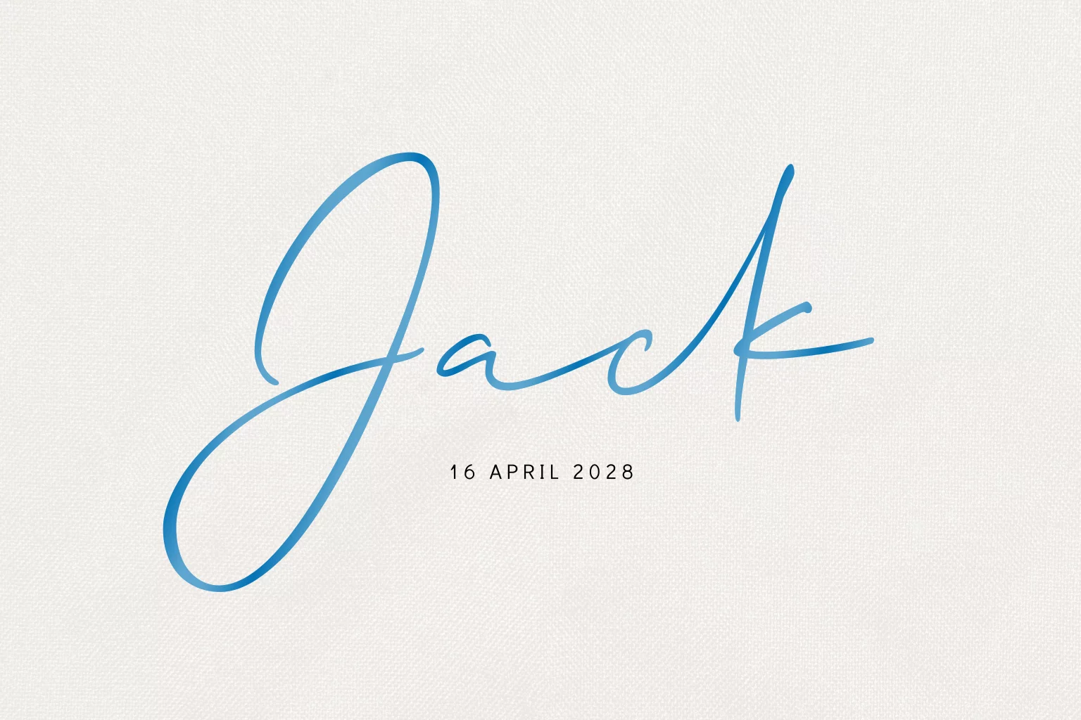 Dit prachtige geboortekaartje voor een jongen heeft een neutraal en clean ontwerp met enkel de geboortedatum en naam in blauw hoogglans spot-uv lak. De hoogglans afwerking en linnenlook achtergrond, in een rustgevende beige kleur, geven het kaartje een tijdloze uitstraling. De babynaam is prominent aanwezig en valt extra op door de hoogglans afwerking. Dit geboortekaartje Jack is perfect voor ouders die op zoek zijn naar een clean en minimalistisch ontwerp.