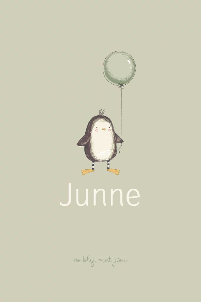 Lief geboortekaartje voor een jongen. Op dit geboortekaartje Junne zie je een schattig geïllustreerde pinguïn die een ballon vast houdt. De kaart heeft een mooie zachte groene kleur met afgeronde hoeken.