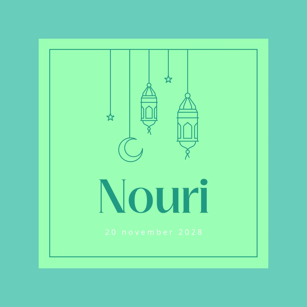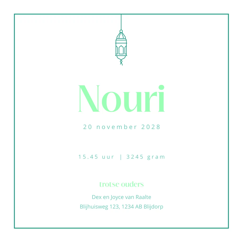 Prachtig geïllustreerd islamitisch geboortekaartje voor een jongen! De combinatie van traditionele olielampjes en een eigentijds ontwerp zorgt voor een tijdloos geboortekaartje. Op het geboortekaartje zie je een groen kader met olielampjes en de babynaam. Pas het geboortekaartje Nouri naar eigen wens aan in onze online editor zodat dit kaartje perfect aansluit bij jullie wensen. Met de bijpassende envelopkleur petrol en een sluitzegel maak je het geboortekaartje helemaal af.