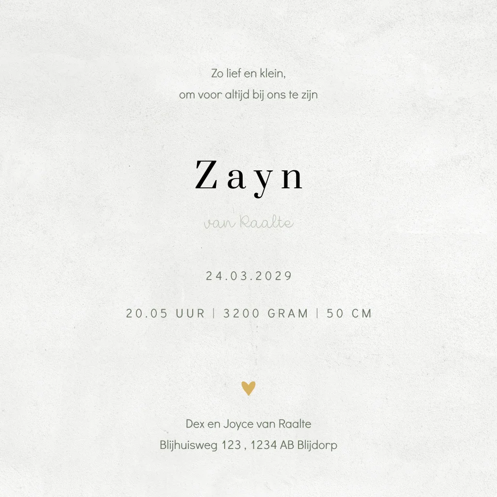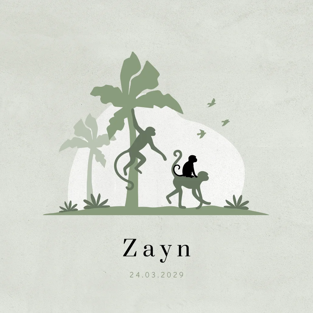 Jungle geboortekaartje voor een jongen in natuurlijke kleurtinten. Op dit jongenskaartje Zayn zie je een silhouet van twee grote apen en één klein aapje in de jungle. Het kleine aapje zit op de rug van de grote aap. Teksten en kleuren zijn eenvoudig aan te passen in de editor. De donkergroene envelopkleur maakt dit geboortekaartje voor jullie zoon of dochter helemaal in stijl af.