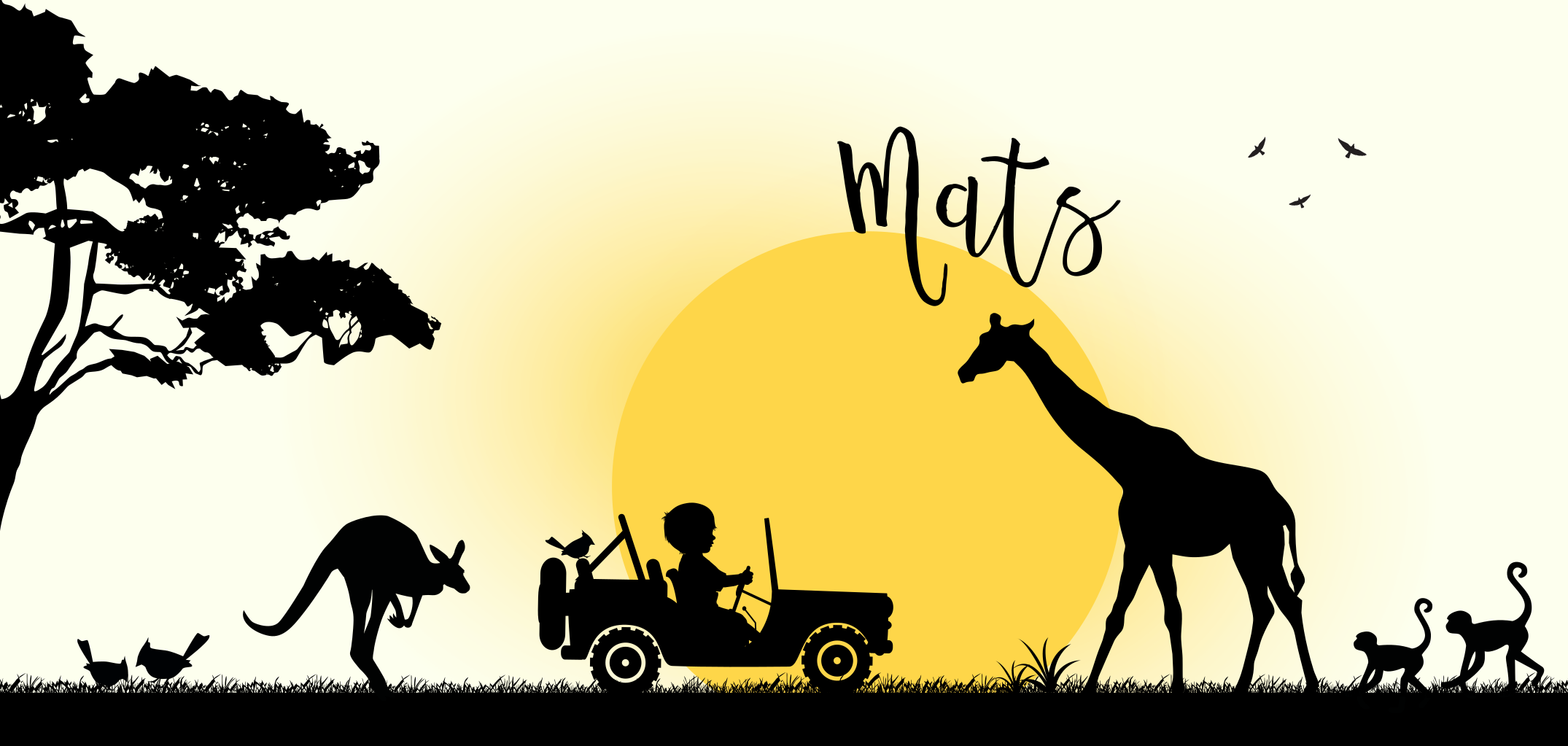 Een jungle geboortekaartje met silhouetten van dieren op de voorzijde en jongetje in een jeep. Liever andere silhouetten van de jungle dieren? geef ons rustig jouw wensen door.