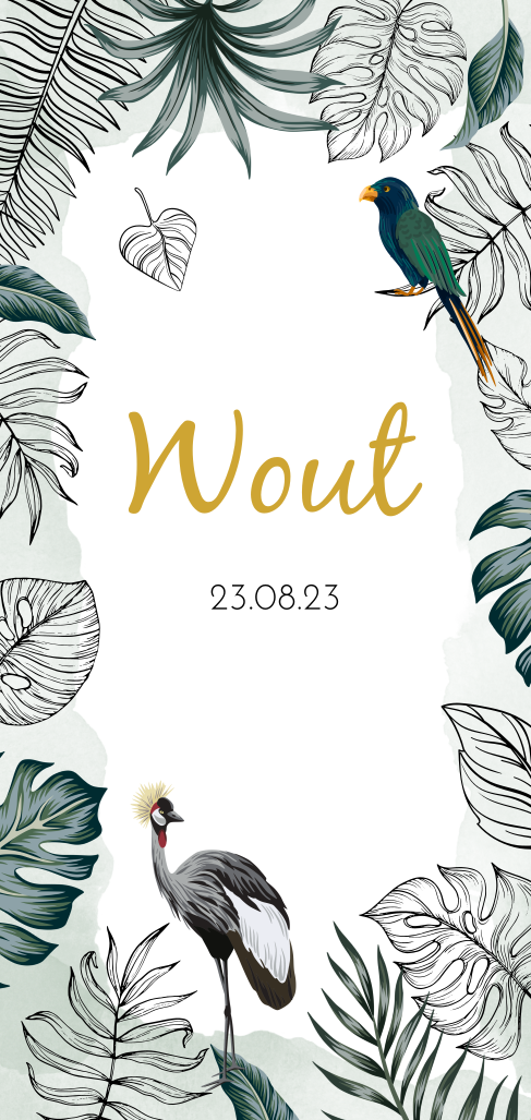 Jungle geboortekaartje met verschillende getekende botanische bladeren en tropische vogels. Op de achtergrond van dit kaartje Wout een groene aquarel. De teksten pas je gemakkelijk aan in de editor.