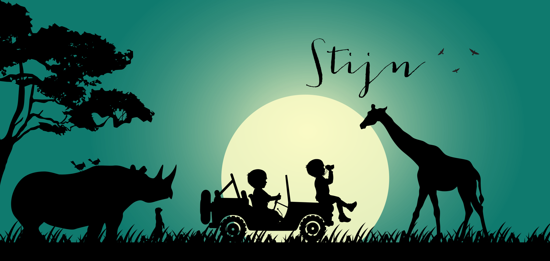 Silhouet geboortekaartje met dieren en jongen in de auto. De dieren en de volle maan geven de kaart een jungle sfeer. De kleuren en de silhouetten kunnen worden aan gepast naar eigen wens.