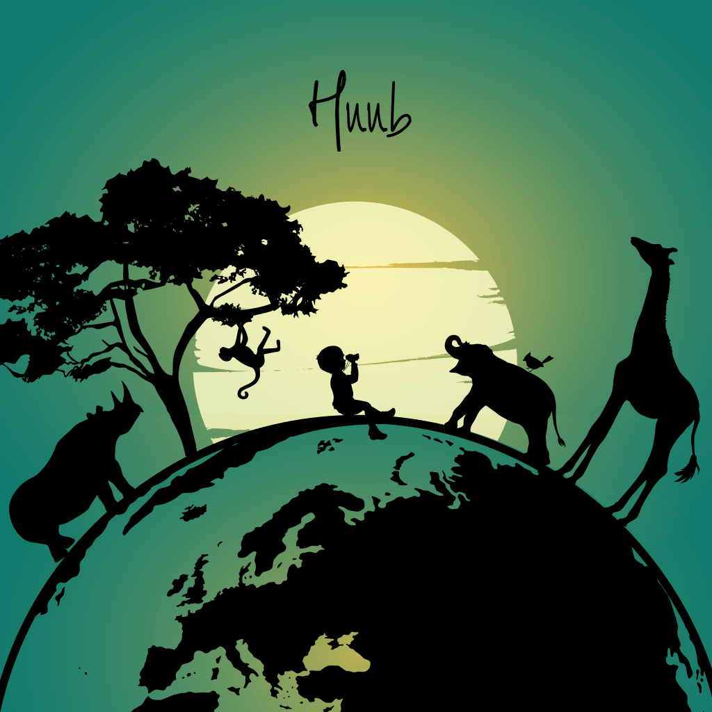 Jungle geboortekaartje voor een jongen, met olifant, neushoorn en andere safari dieren op de voorzijde. De kleurencombinatie geven deze kaart met de naam Huub een echte avontuurlijke sfeer.
