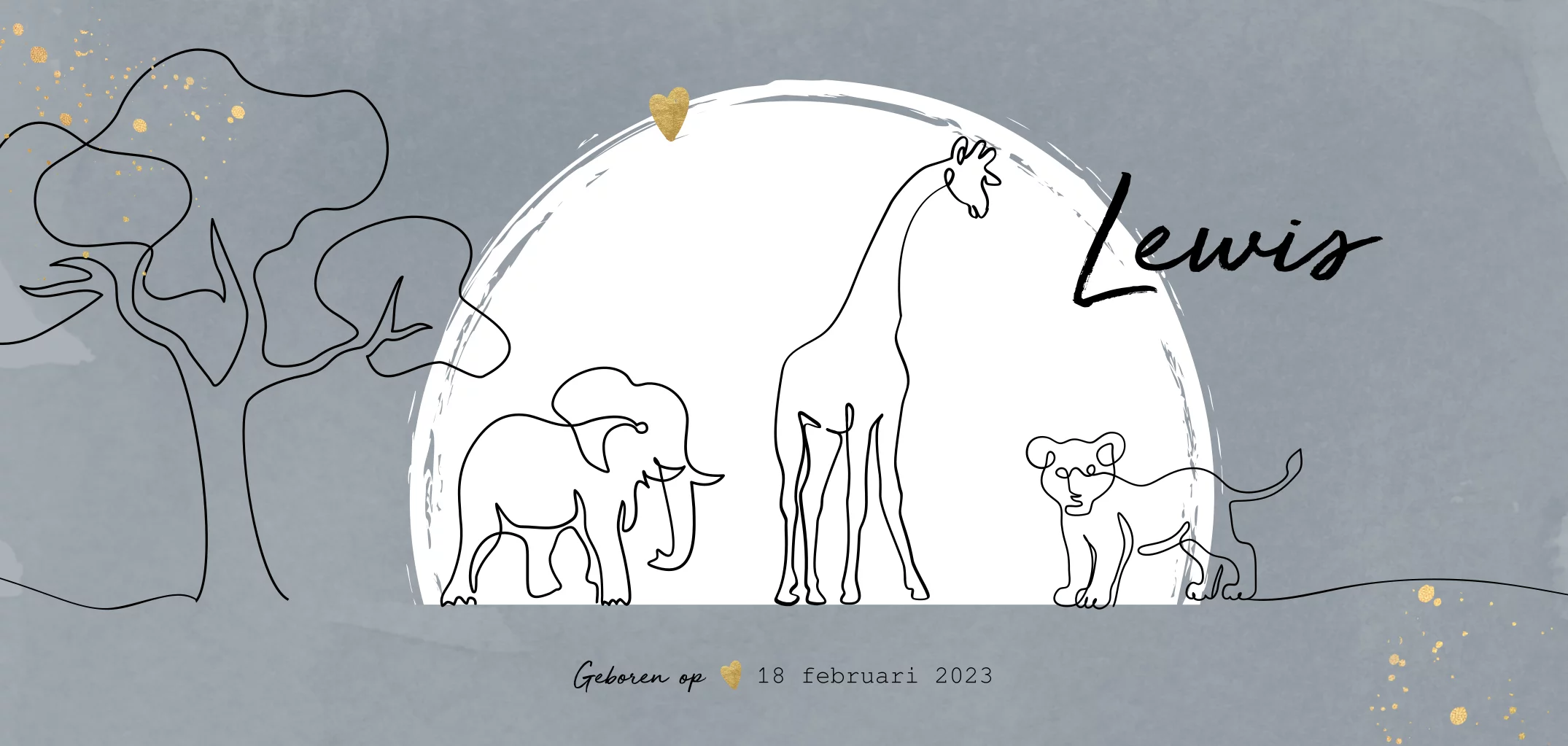 Hip jungle geboortekaartje voor een jongen. Op dit kaartje Lewis staan verschillende one-line-drawing illustraties van safari dieren: een olifant, giraffe en een leeuwtje. Op de achtergrond blauw met aquarel. Een lief en rustig kaartje die je naar je eigen smaak kunt aanpassen in de editor.