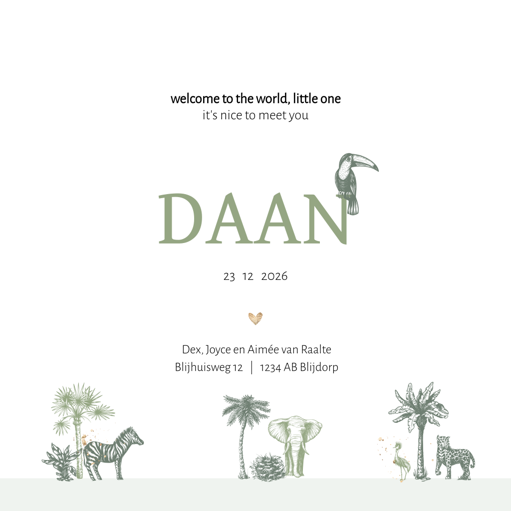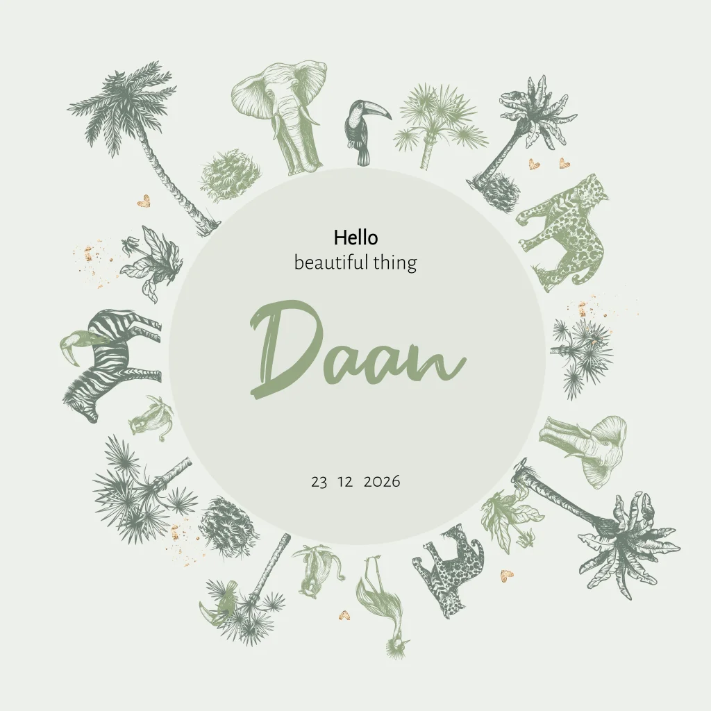 Jungle geboortekaartje voor een zoon met een wereldbol vol met safari dieren en tropische palmbomen. Op dit jongenskaartje Daan staan o.a. olifanten, een zebra, luipaard en toekans in verschillende groene tinten. Mooi gedecoreerd met kleine goudkleurige hartjes. Deze kaart kun je zelf bewerken en naar je eigen smaak aanpassen in onze editor.