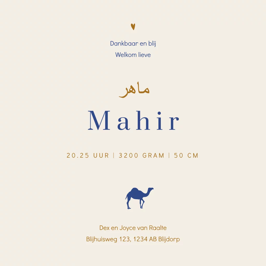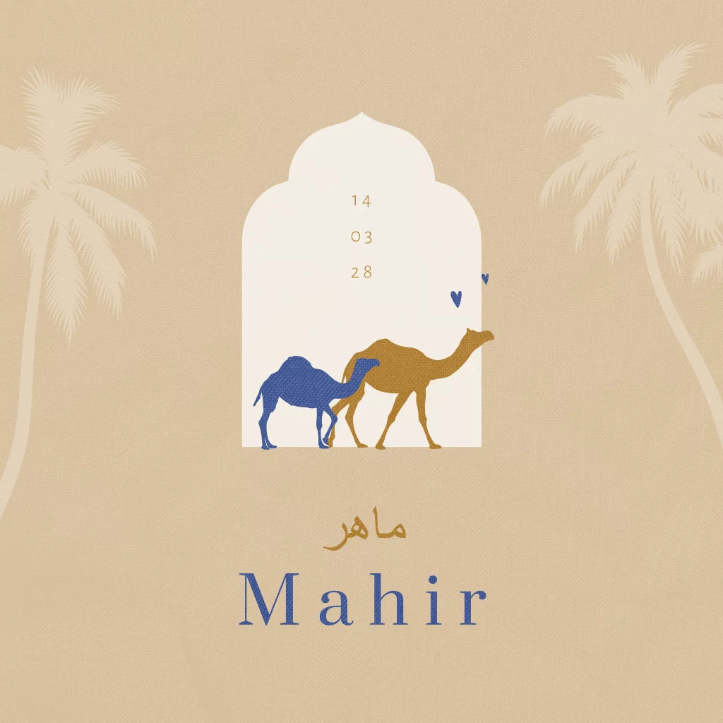 Op dit neutrale Arabische geboortekaartje Mahir vind je twee kamelen (dromedarissen) die samen op pad zijn. Je ziet een grote kameel met daarachter aansluitend een klein kameeltje. Om de kamelen heen zie je een kader en twee palmbomen. Dit kaartje is ook zeker geschikt voor een tweede kindje. Pas de teksten, kleuren en lettertypes van dit islamitische kaartje naar je eigen smaak aan in de editor.