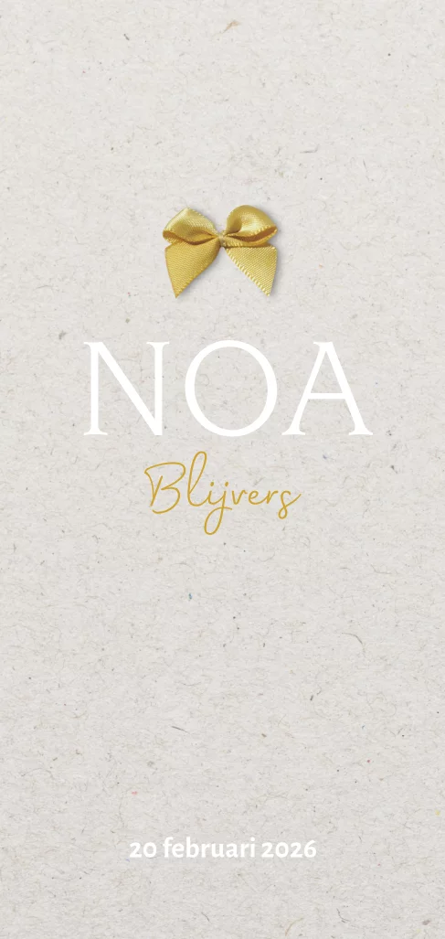 Dit geboortekaartje is voorzien van een écht strikje. De strikjes worden niet standaard meegeleverd, maar zijn bij te bestellen. Het strikje op dit kaartje dient als voorbeeld en wordt niet gedrukt! Op die plek kun je straks zelf het échte strikje plakken.