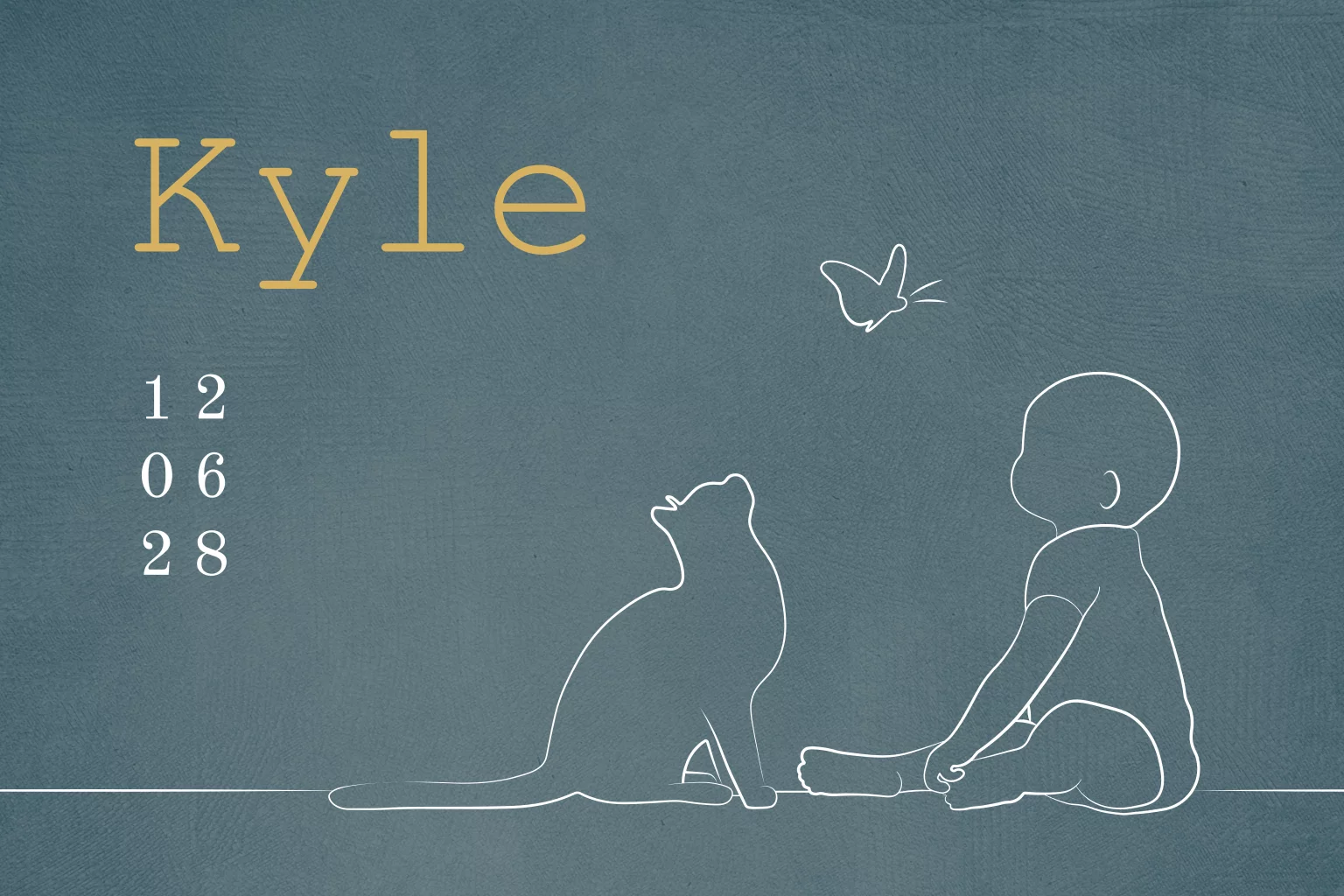 Geef je zoon een stoere start met dit geboortekaartje Kyle! Dit geboortekaartje voor een jongen heeft een rustig design met een blauwe structuur achtergrond. Op dit kaartje een lijntekening van een kat met baby. Ze kijken naar een vlindertje. De naam van je baby staat geschreven in een hip lettertype. Pas de kleuren en lettertypes aan in de online editor.