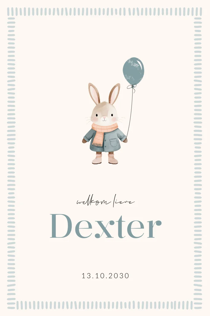 Geboortekaartje voor een jongen met een schattig konijntje. Het konijntje heeft een jasje en sjaal om en houdt een ballon vast. Het gestreepte kader maakt het kaartje helemaal compleet. Je kunt dit geboortekaartje Dexter naar je eigen wensen aanpassen in de editor. Hulp nodig bij het ontwerpen? Neem contact met ons op!