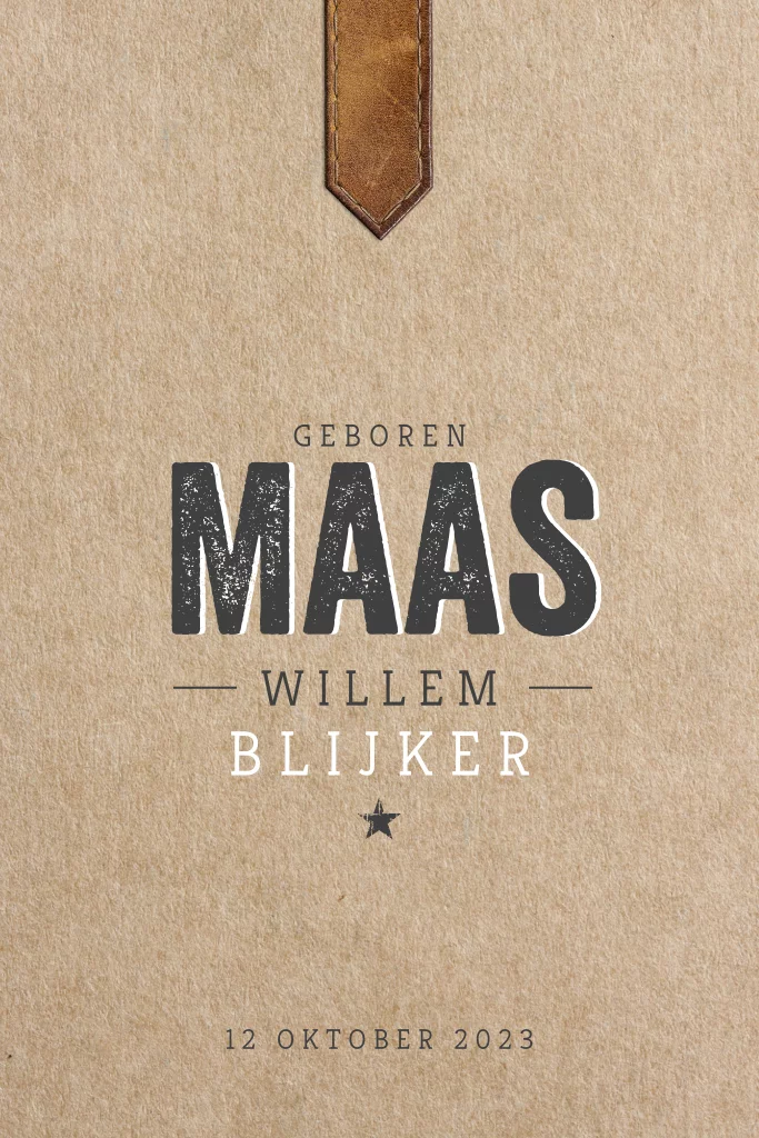 Jongens geboortekaartje met een karton achtergrond, een klein labeltje van leer en een sterretje. De babynaam Maas staat in een stoer lettertype. Pas dit kaartje naar je eigen wensen aan in de editor.