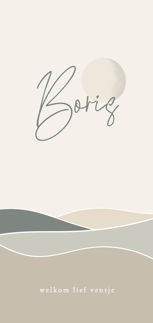 Een geboortekaartje voor een lief ventje, in trendy kleuren. Op dit babykaartje met de naam Boris staat een maan afgebeeld boven een heuvelachtig landschap. Teksten en kleuren zijn makkelijk aan te passen in onze editor. Hulp nodig? Wij helpen je graag verder.