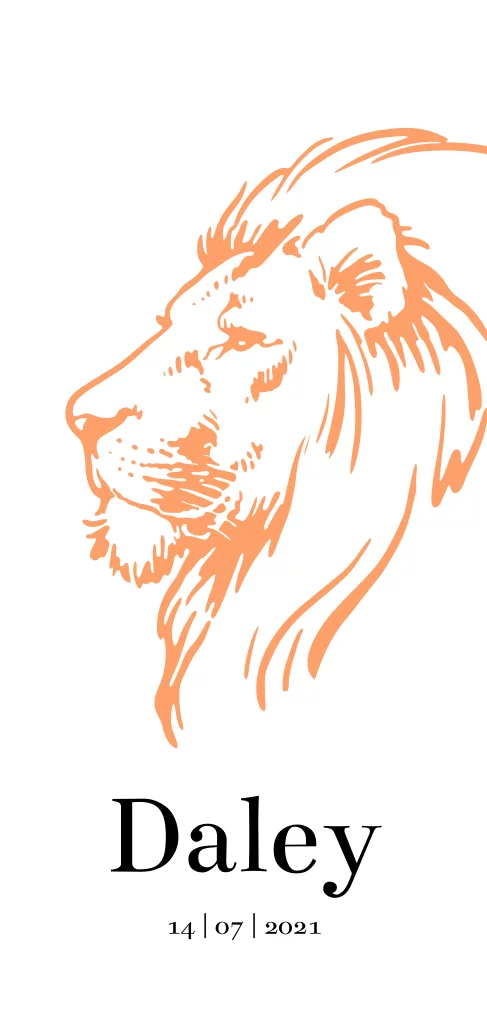 Een stoere kaart voor een zoon in Oranje thema. Dit geboortekaartje Daley heeft een witte achtergrond met daarop een grote, oranje leeuw. Superleuk kaartje voor een jongen die wordt geboren rond een EK of WK! Of tijdens een ander sportevenement, voor welk nationale team dan ook. Dit kaartje is eenvoudig naar eigen smaak aan te passen in de editor.