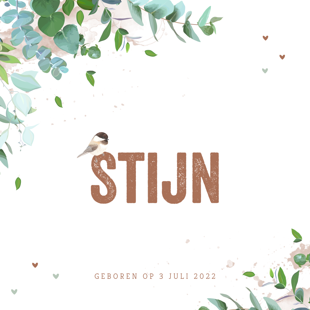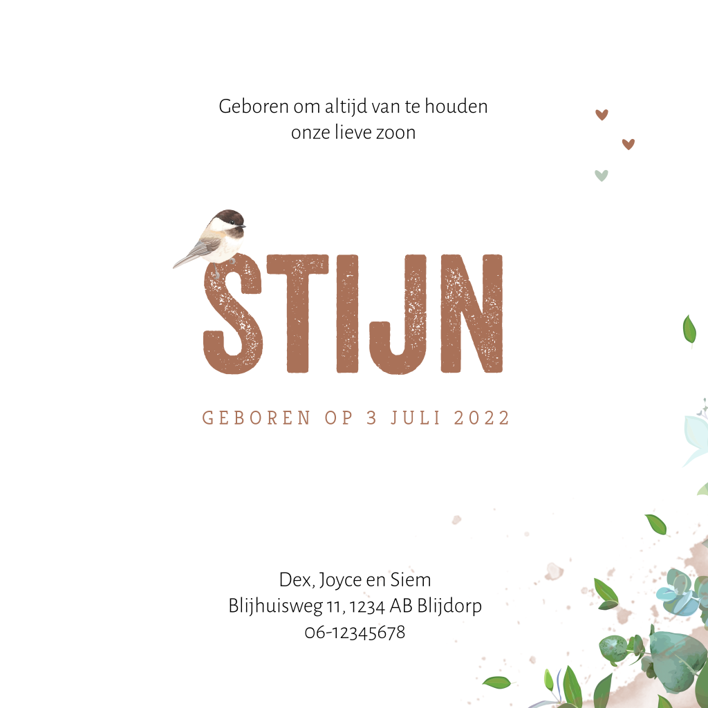 Lief geboortekaartje voor een jongen met bloemen, takjes en aquarel. Op de naam staat een schattig watercolor vogeltje.