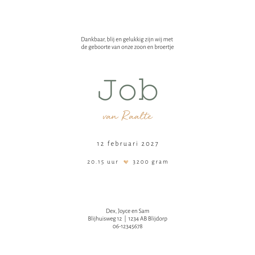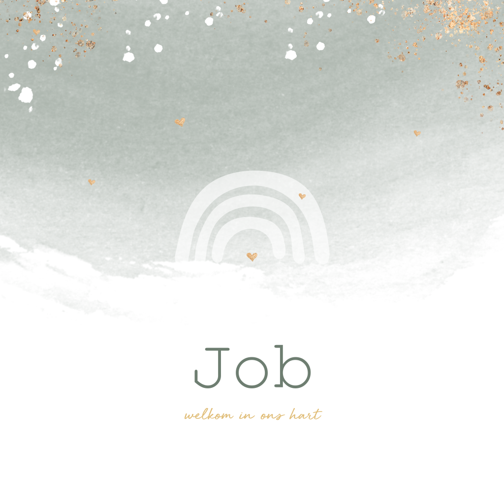Lief Christelijk jongens geboortekaartje met een kleine trendy regenboog en hartje. Op de achtergrond een groene aquarel met kleine witte en gouden spetters en hartjes. Op dit christelijke geboortekaartje staat de bijbelse naam Job en aan de binnenkant van het kaartje staat een bijbeltekst. Teksten en kleuren pas je naar je eigen smaak aan in de editor.