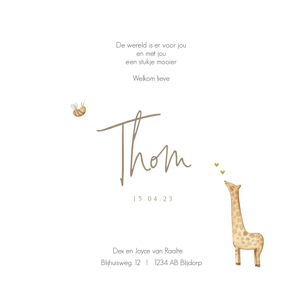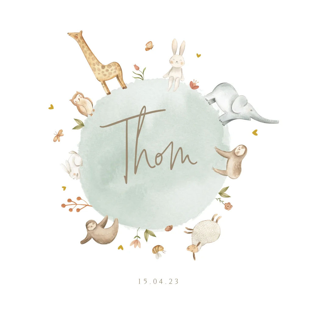 Lief geboortekaartje voor een zoon met verschillende vrolijke dieren op een aquarel wereldbol, waaronder een olifantje, konijntje, giraffe, schaapje en uiltje. De teksten en kleuren van dit jongenskaartje Thom zijn aan te passen in de editor.