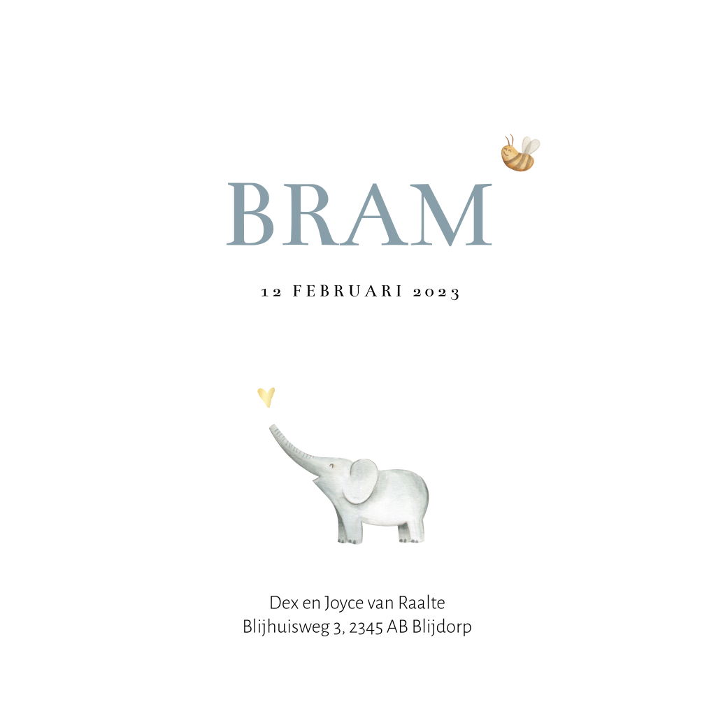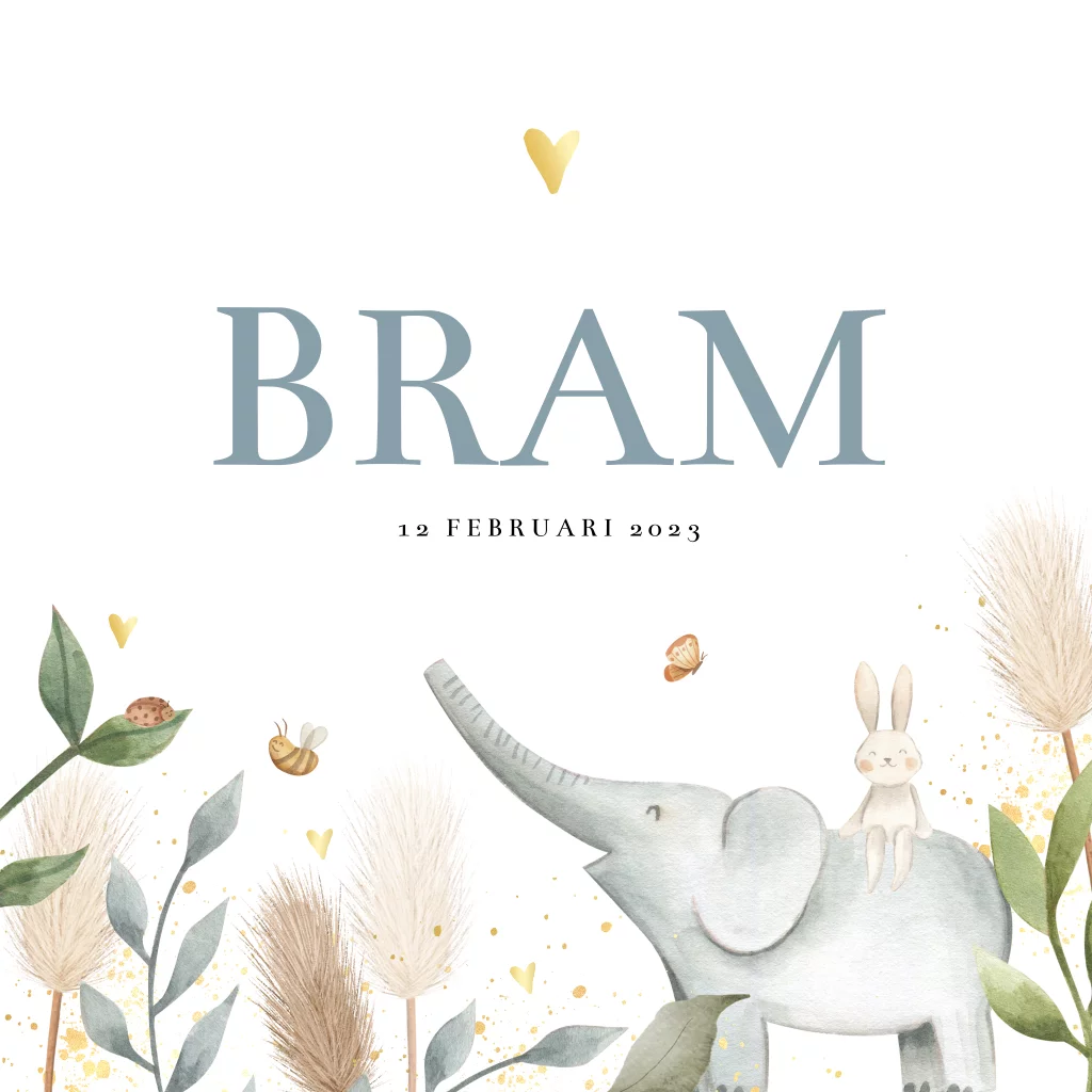 Lief jongenskaartje met olifantje, konijntje en verschillende droogbloemen in zachte aquarel kleuren. Verder op dit kaartje Bram een vlindertje, bijtje, lieveheersbeestje en kleine goudkleurige spetters en hartjes. Teksten en kleuren zijn aan te passen in de editor.