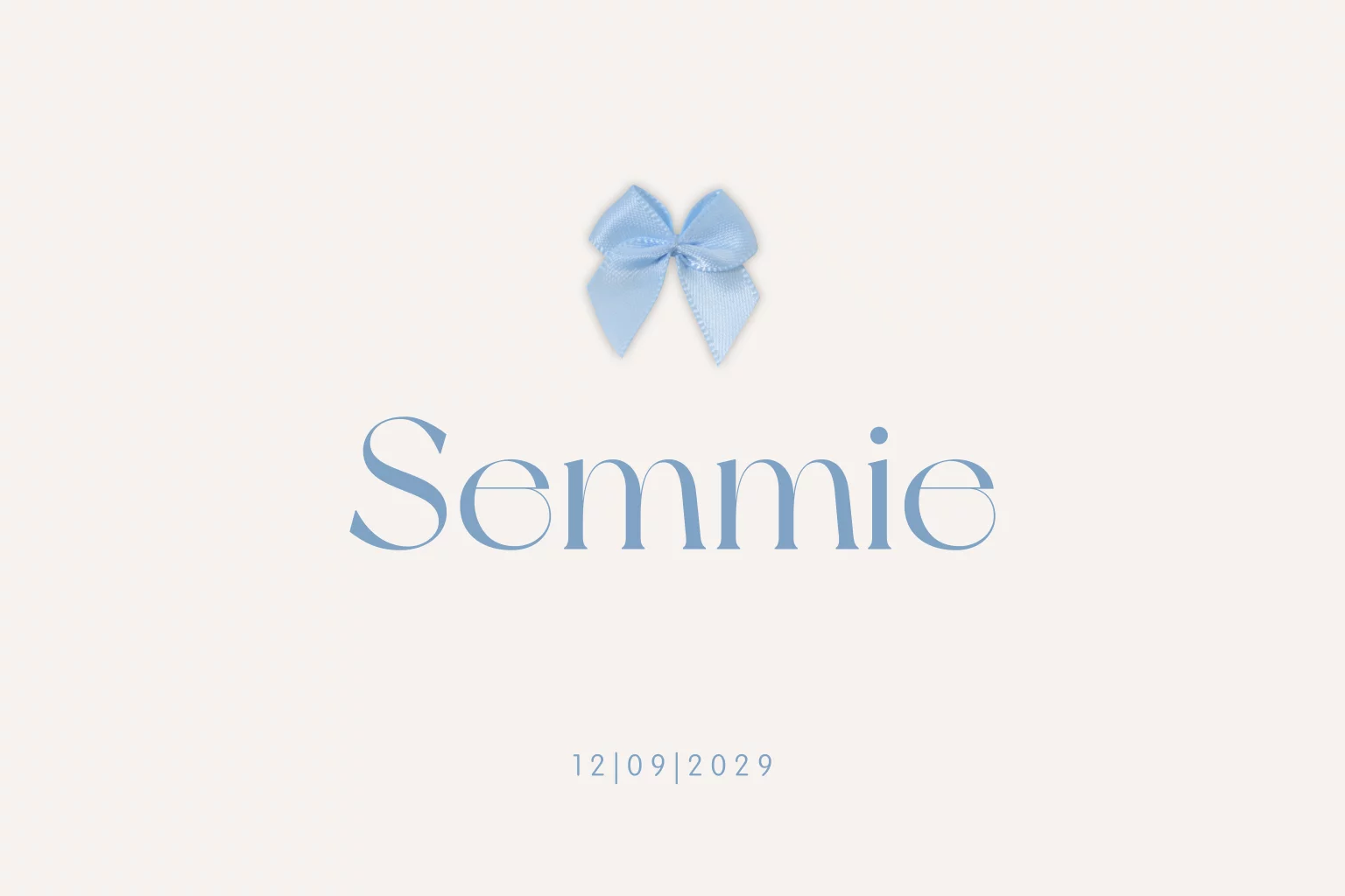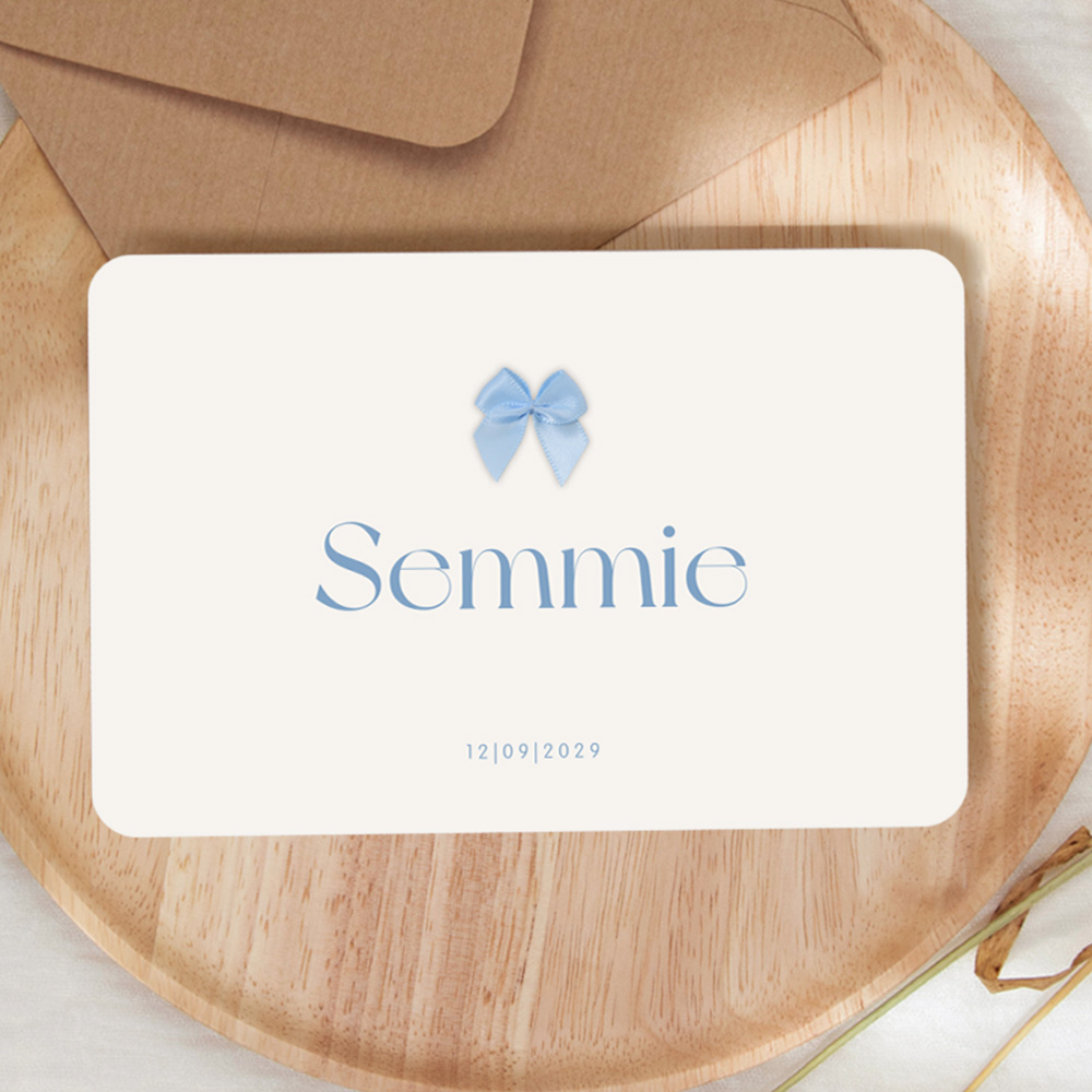 Een basic en klassiek geboortekaartje voor een jongen. Dit geboortekaartje Semmie met afgeronde hoeken is voorzien van een écht strikje. De afgeronde hoeken zorgen voor een speels effect voor het geboortekaartje van jullie zoon. Dit geboortekaartje is geïnspireerd op het kaartje Semmie van Roos van der Aa.