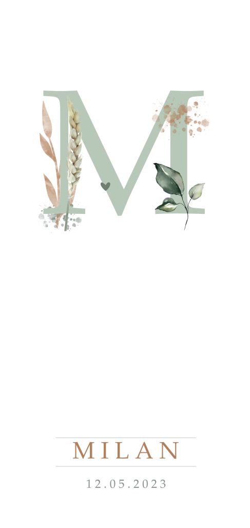 Lief geboortekaartje voor een zoon met de eerste letter van de naam prominent op de kaart. De kaart oogt verder rustig met een paar geschilderde bloem takjes en een klein hartje. De letter, kleuren en teksten van dit kaartje Milan zijn aan te passen in de editor.