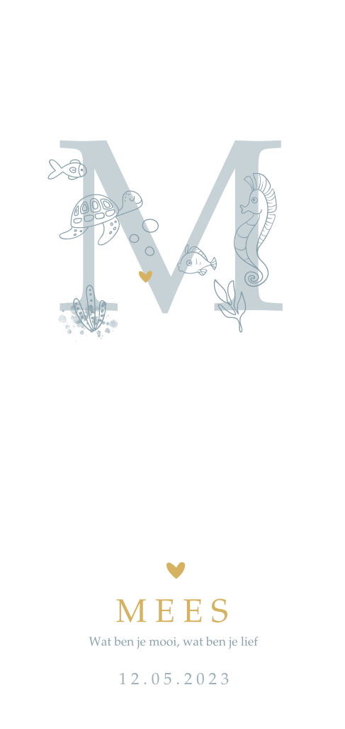 Lief en rustig geboortekaartje voor een jongen. De eerste letter van de baby naam staat centraal op de kaart. Rondom de letter staan verschillende dieren uit de zee, waaronder vissen, een schildpad en zeepaardje. Dit kaartje Mees is overwegend wit en oogt daardoor clean. Kleuren en lettertypes zijn aan te passen in de editor.