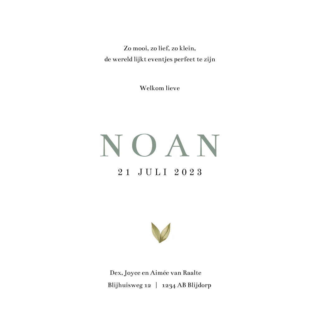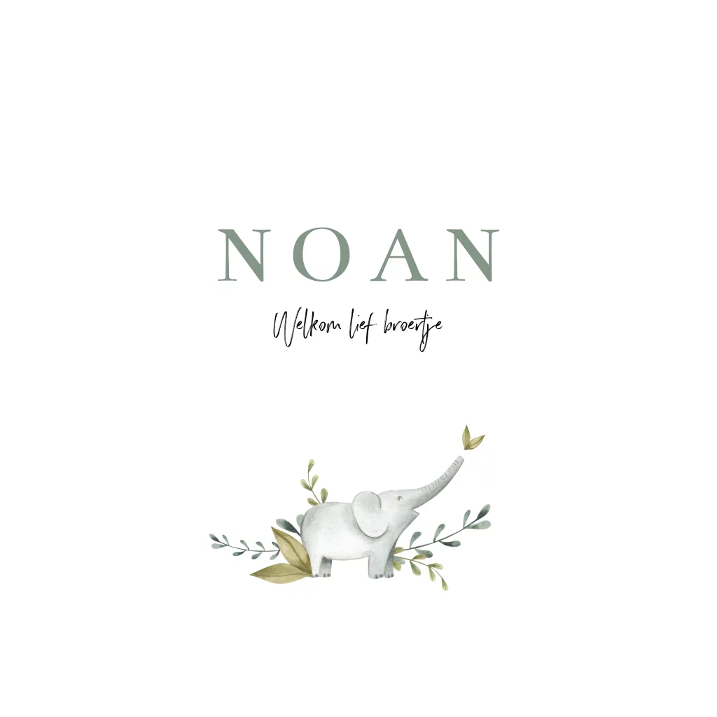 Lief geboortekaartje voor een jongen. Dit kaartje Noan heeft een rustig design met een lief klein olifantje. Wil je meer of andere afbeeldingen toevoegen passend bij dit thema, dan kun je deze afbeeldingen in de editor vinden in het mapje: Thema Lief Aquarel.