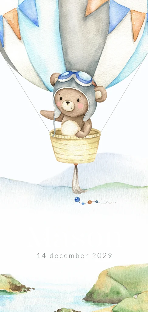 Luchtballon geboortekaartje voor een jongen met beer, bergen en folie