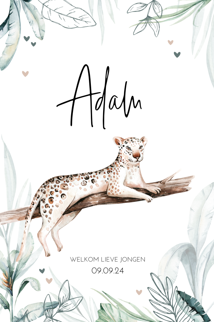 Jungle geboortekaartje voor een zoon met een luipaard / panter die heerlijk aan het luieren is op een dikke boomtak. De babynaam Adam staat in een mooi sierlijk lettertype. Op de achtergrond mooie watercolor bladeren en kleine hartjes. Pas dit kaartje naar je eigen smaak aan in de editor en combineer met een mooi envelop om het helemaal af te maken.