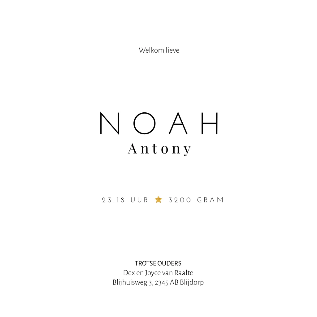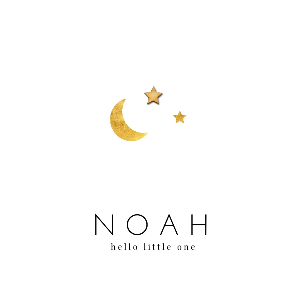 Basic jongens geboortekaartje Noah met maan en sterretjes. Dit kaartje is voorzien van 1 écht houten sterretje. Houten vormpjes worden niet standaard meegeleverd, maar zijn bij te bestellen. Het houten vormpje op dit kaartje dient als voorbeeld en wordt niet gedrukt! Op die plek kun je straks zelf het échte houten vormpje plakken.