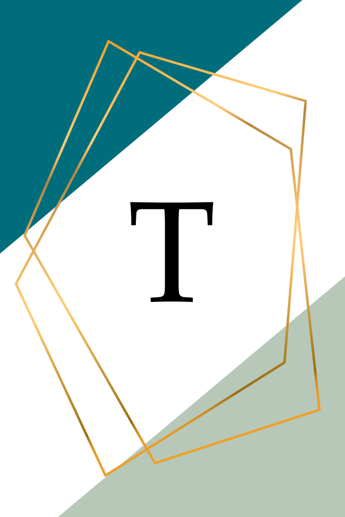 modern geboortekaartje voor een jongen met schuine vlakken met daar overheen gouden geometrische lijnen. De eerste letter van de naam op dit babykaartje Tom staat groot aan de voorkant.