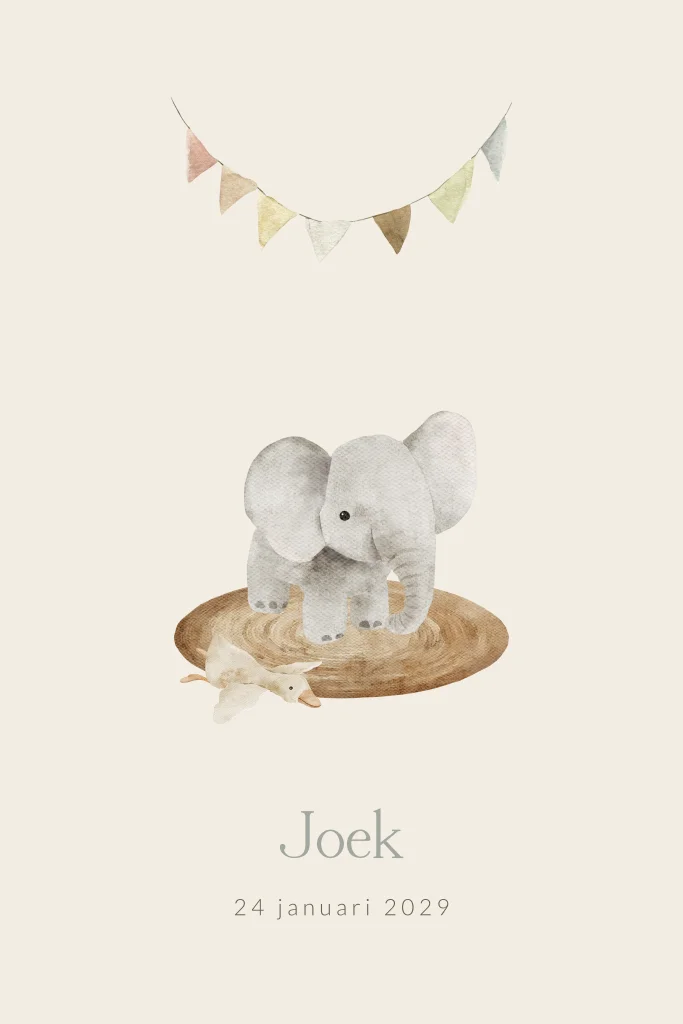 Lief geboortekaartje met een olifant knuffel, gans knuffeltje en een vlaggenlijn. Dit geboortekaartje Joek heeft afgeronde hoeken en een enkel formaat. Je kunt deze kaart zelf gemakkelijk bewerken, opslaan en bestellen. Vragen of wensen? Laat het gerust weten, wij helpen je graag.