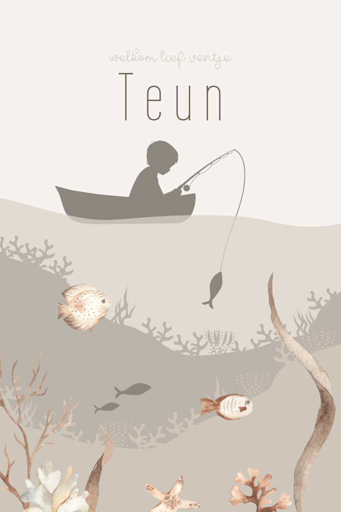 Gek van vissen? Dan is dit jongens geboortekaartje zeker geschikt! Op dit geboortekaartje Teun een silhouet van een jongen in een bootje aan het vissen en hij heeft beet! Onder het bootje een grijs bruin ton sur ton onderwaterwereld met waterplanten en vissen. Dit babykaartje is voorzien van ronde hoeken en heeft een witte achtergrond met grijze accenten. In onze online editor kun je het kaartje helemaal aanpassen naar je eigen wensen.