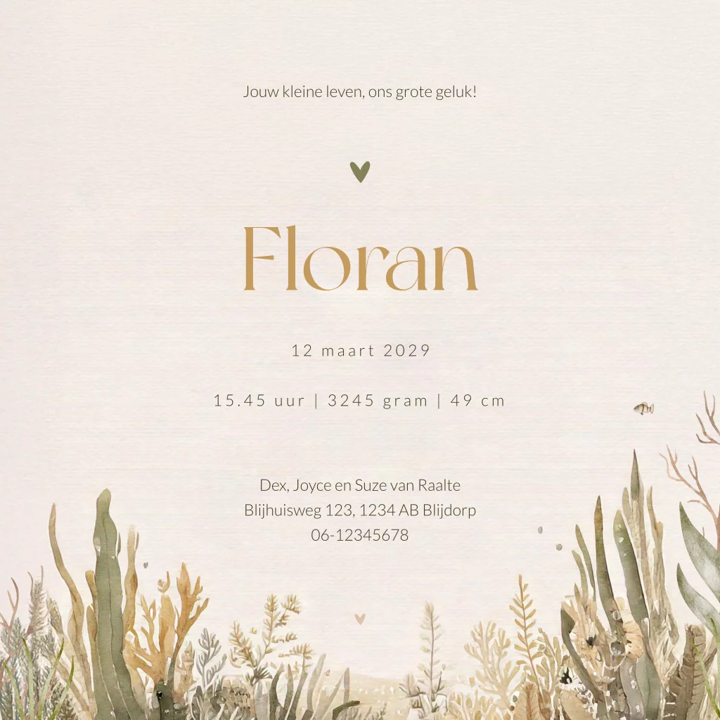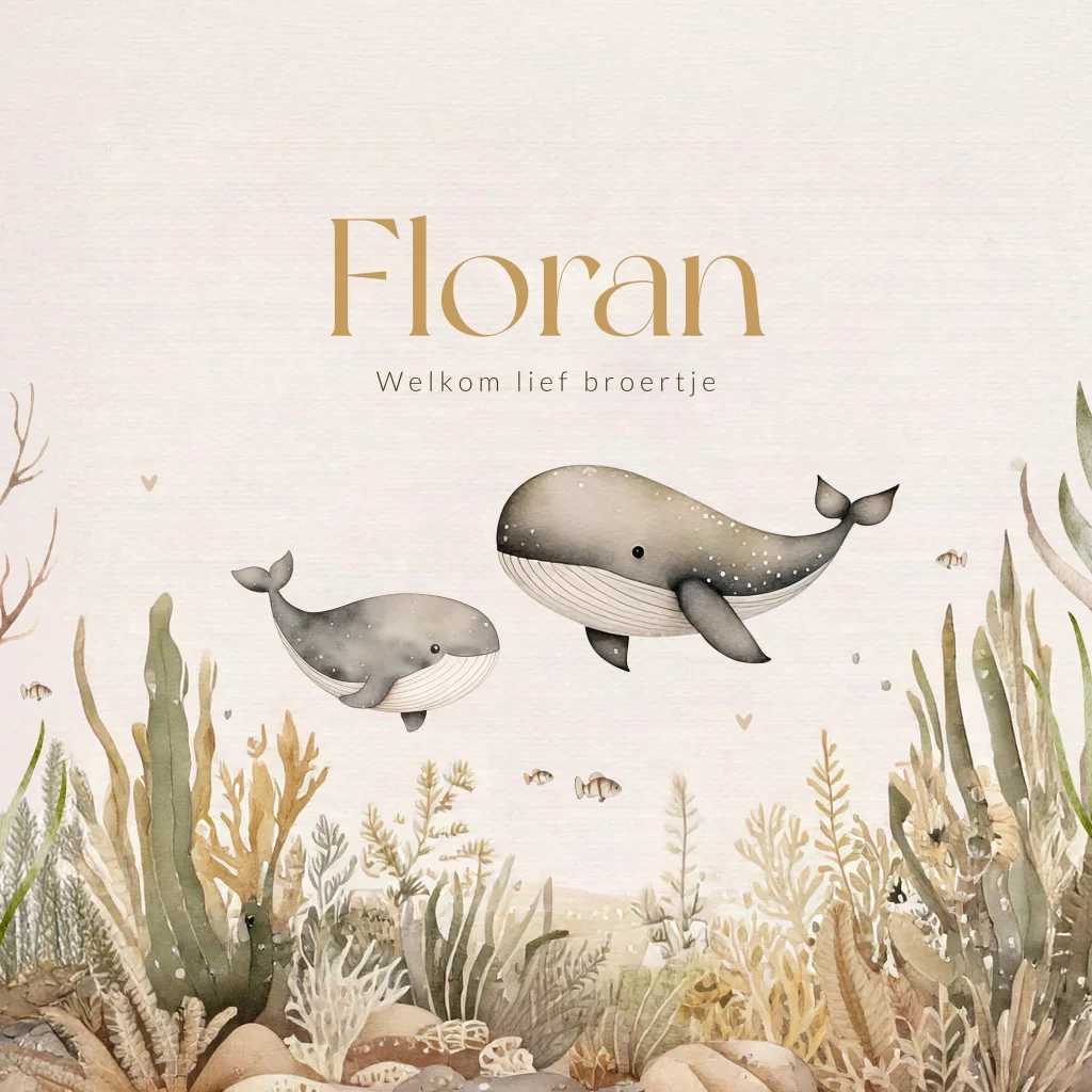 Geboortekaartje voor een jognen, Floran, in onderwaterwereld thema. Op dit kaartje voor een broertje zwemmen er twee walvissen in de zee. Door de bruin en beige tinten past dit kaartje bij elke envelop maar door de paarse kleur van de naam raden wij envelopkleur olijfgroen aan!