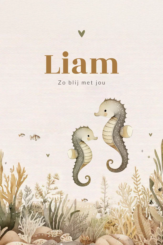 Stoer geboortekaartje voor een jongen met onderwaterwereld thema! Op dit kaartje Liam staan twee zeepaardjes die onder water aan het zwemmen zijn. Boven de naam staat een klein hartje. Door de rustige bruintinten passen bij dit kaartje heel veel kleuren enveloppen, wij raden envelopkleur donkergroen als meeste aan. Dit kaartje is afgewerkt met ronde hoeken.