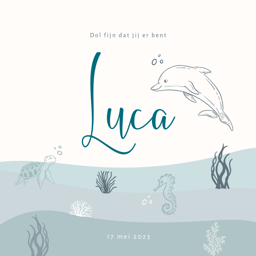 "Dol fijn dat jij er bent." Lief geboortekaartje Luca voor een broertje in het thema onderwaterwereld. Op dit babykaartje voor een jongen een dolfijn, zeepaardje en schildpad. Liever andere kleuren, teksten of lettertypes? Dan pas je dit oceaan kaartje voor jullie zoon eenvoudig aan in onze editor.