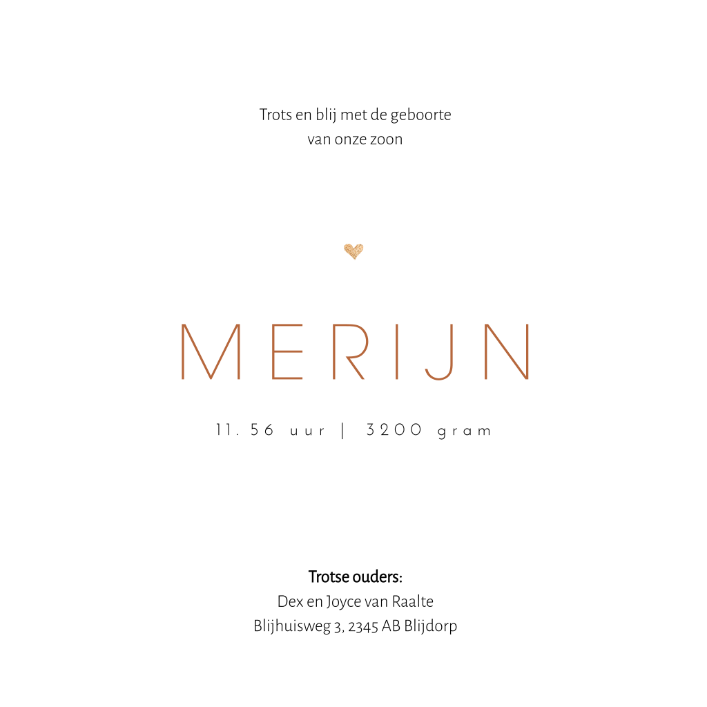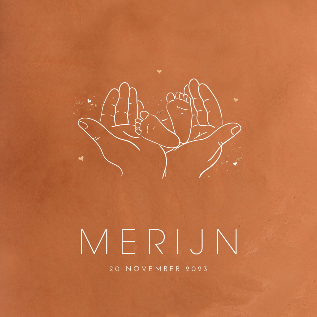 Jongens geboortekaartje met een one line illustratie van handen met daarin kleine baby voetjes. Dit kaartje Merijn heeft een trendy roestbruine aquarel achtergrond, een mooie combinatie met de witte tekst en lijntekening. Wat kleine gouden details maken het kaartje af. Pas het kaartje naar je eigen smaak aan in de editor en combineer met een mooie bijpassende envelop.