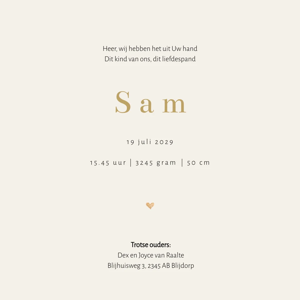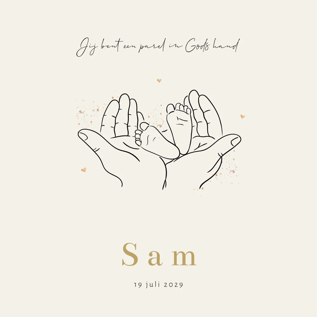 Christelijk geboortekaartje met een one line illustratie van handen met daarin de kleine voeten van een baby. Dit kaartje Sam is het perfecte kaartje wanneer je een kaartje zoekt bij de tekst; 'Je bent een parel in Gods hand' en kan gebruikt worden voor zowel een jongen als een meisje. Achter de lijntekening kleine gouden hartjes en spetters. Pas het kaartje naar je eigen smaak aan in de editor en combineer met een mooie envelop om het helemaal af te maken.