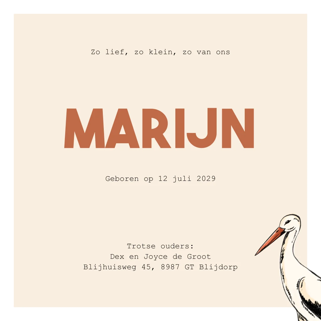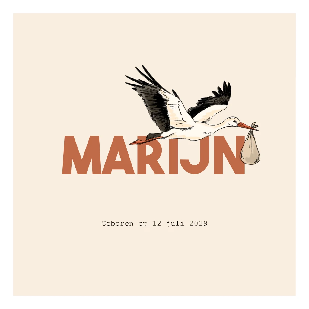 Jongens geboortekaartje met een ooievaar. De ooievaar vliegt en bezorgd de baby. De achtergrond heeft een lichte neutrale kleur met wit kader. Je kunt dit geboortekaartje Marijn aanpassen naar je eigen smaak in de editor. We helpen je graag als je hulp nodig hebt!