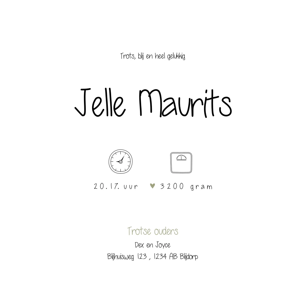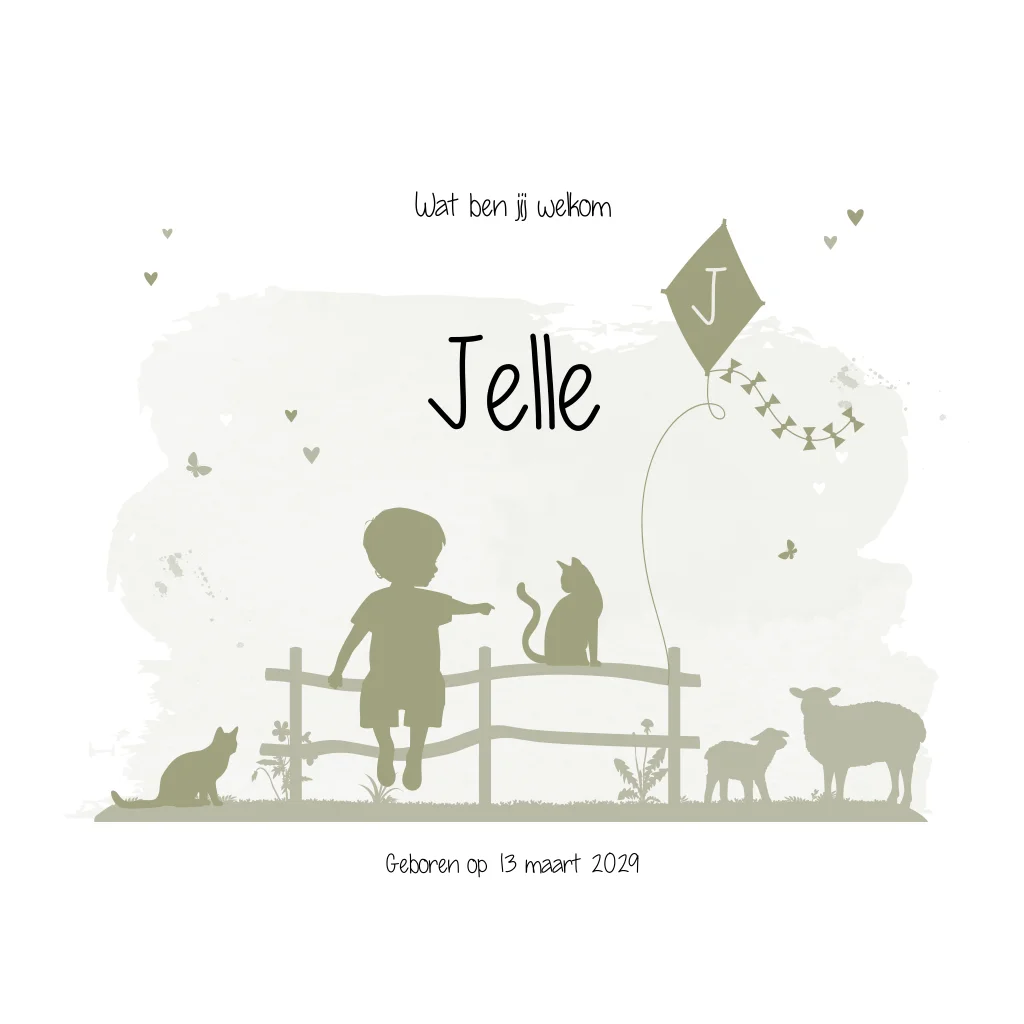 Wanneer je op zoek bent naar een leuk geboortekaartje voor een jongen, is dit kaartje een perfecte keuze! Het kaartje heeft een unieke en rustige uitstraling met silhouetje van een jongen op een hek met boerderijdieren waaronder een lammetje en kat. Op de achtergrond hartjes, vlindertjes en een vlieger met de voorletter van jullie kindje erop. Dit jongenskaartje Jelle pas je geheel naar eigen wens aan in de editor. Dit geboortekaartje is ook mogelijk voor een andere gezinssamenstelling. Hulp nodig? We staan voor je klaar! Bel, mail of chat gerust.