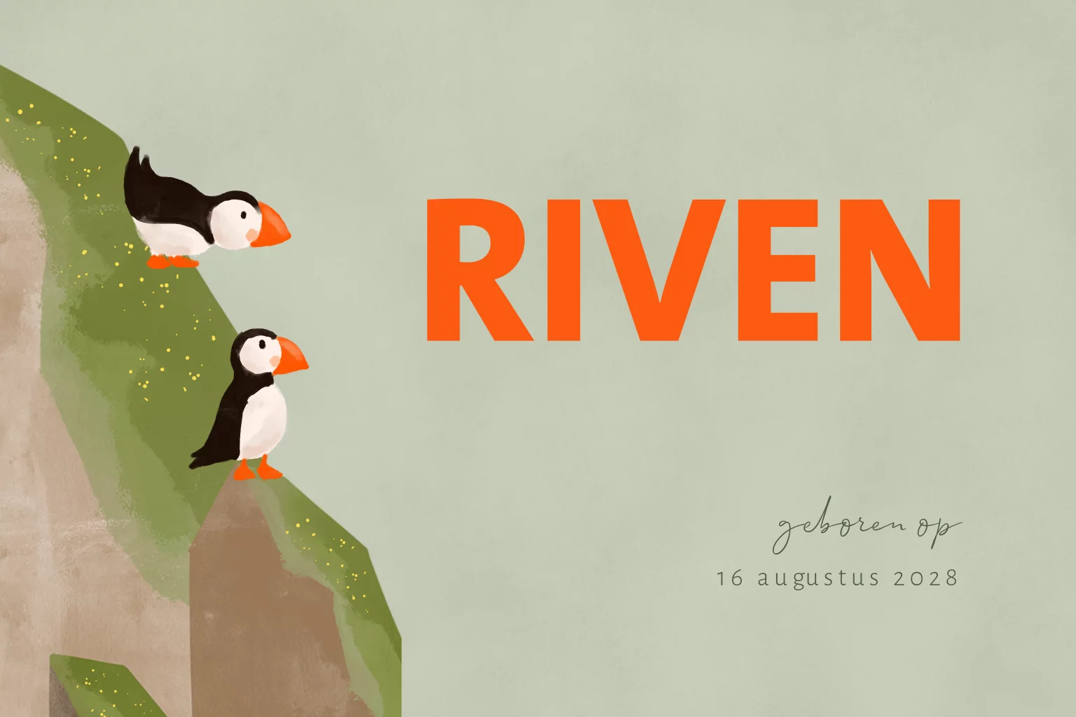 Een stoer geboortekaartje voor een jongen! Op dit geboortekaartje Riven zie je twee papegaaiduikers op een klif zitten terwijl ze naar de babynaam kijken. De rustige natuurlijke kleurtinten van dit geboortekaartje staan mooi in contrast met de oranje kleur van de babynaam en de snavels en pootjes van de papegaaiduikers. Pas het kaartje naar eigen wens aan in de online editor en voeg een bijpassende sluitzegel toe om het kaartje af te maken.