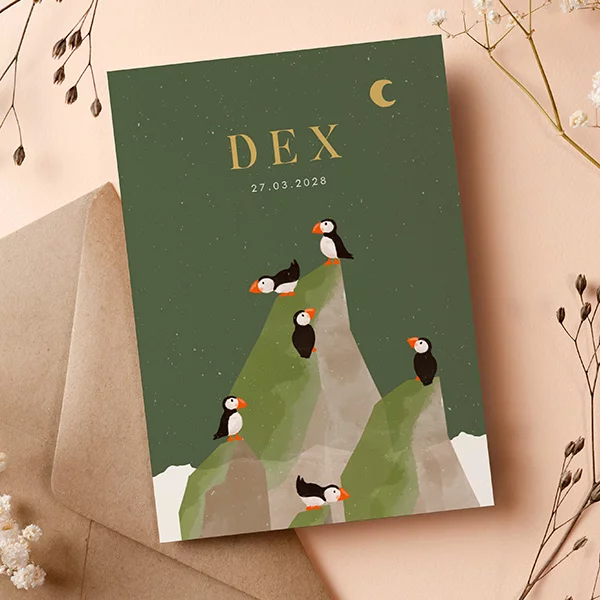Dit prachtige geboortekaartje Dex kondigt de komst van jullie kleine mannetje op een unieke en avontuurlijke manier aan. De illustratie van papegaaiduikers op de kliffen straalt een gevoel van avontuur en natuur uit, perfect voor ouders die van het buitenleven houden. Pas de teksten, lettertypes en kleuren eenvoudig aan in de editor. Hulp nodig bij het ontwerpen? Neem contact met ons op!