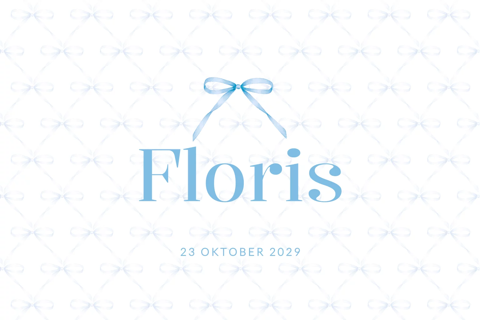 Klassiek geboortekaartje voor een jongen met een patroon van blauwe strikjes. De strikjes steken mooi af tegen de witte achtergrond. Pas de teksten, kleuren en lettertypes naar je eigen smaak aan in de editor. Ook kun je zelf bepalen of je ronde hoeken wilt.