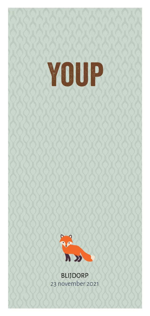 Hip retro geboortekaartje voor een jongen. De voorkant van dit kaartje Youp heeft een patroon uit de jaren '70. De achterkant van deze kaart heeft een knallende oranje kleur. Samen met het geïllustreerde vosje maakt dit een mooi geheel.